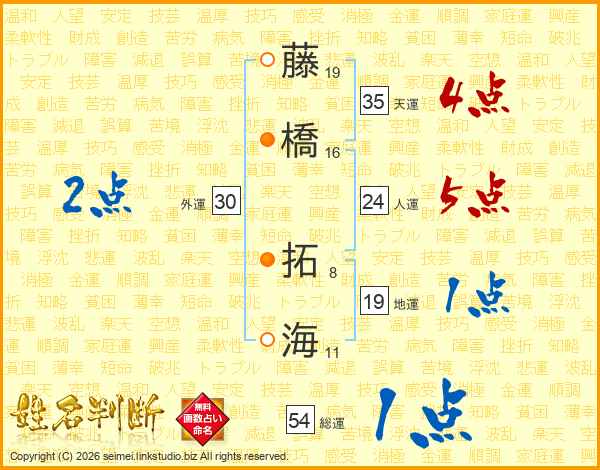 藤(19画)橋(16画) 拓(8画)海(11画)