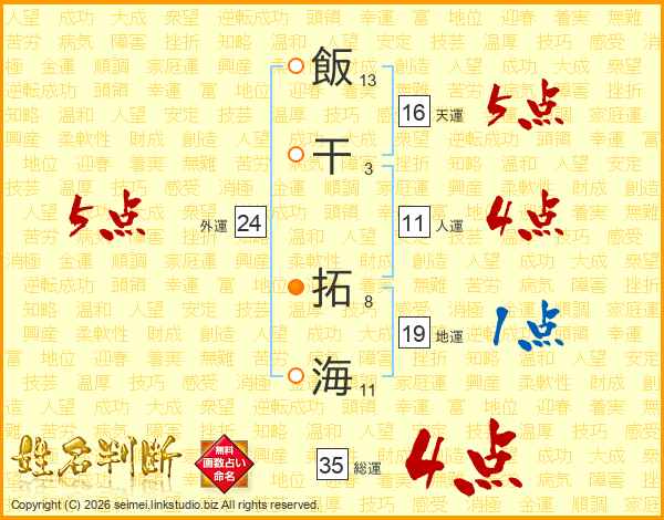 生活面を象徴する運勢です。外部から受ける影響力を表し、結婚運、家庭運や職場、環境への順応性を表します。総運から人運を引いた画数。姓や名が1文字の場合を除く。