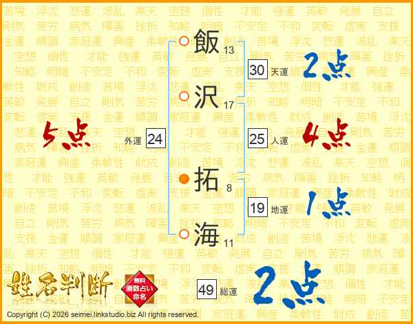 飯沢拓海さんの人運は25画の4点!