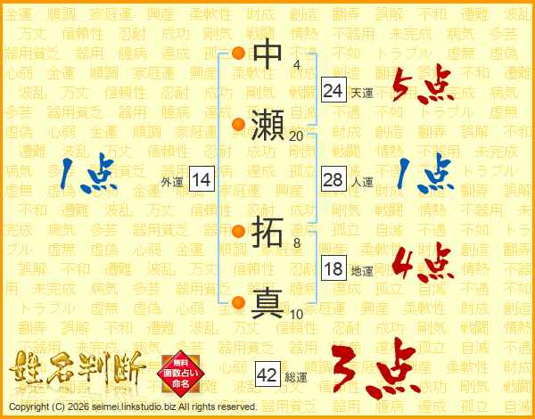 中瀬拓真さんの天運は24画の5点!