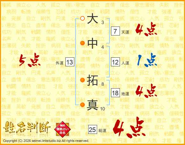 あなたの人生を表す1番重要な運勢です。生涯を通じて影響する総合運となり、主に50歳以降の晩年期に影響を及ぼします。苗字と名前の合計画数。