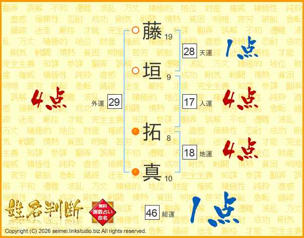 藤(19画)垣(9画) 拓(8画)真(10画)