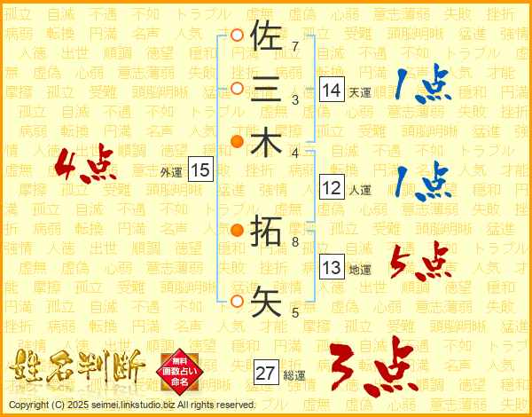 佐(7画)三(3画)木(4画) 拓(8画)矢(5画)