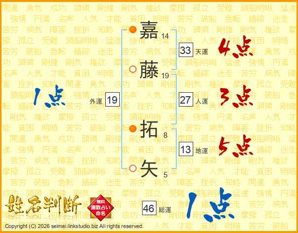 嘉(14画)藤(19画) 拓(8画)矢(5画)