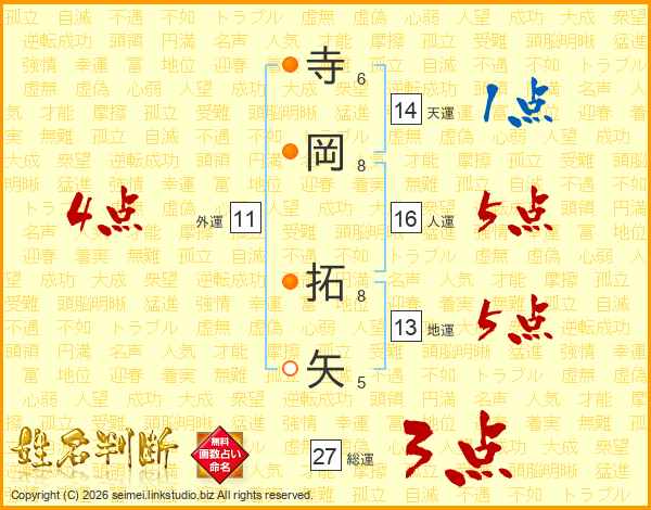 寺(6画)岡(8画) 拓(8画)矢(5画)