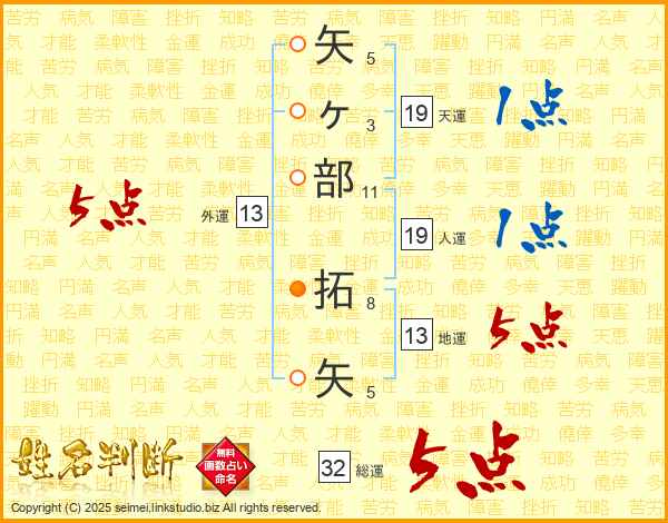 矢(5画)ヶ(3画)部(11画) 拓(8画)矢(5画)