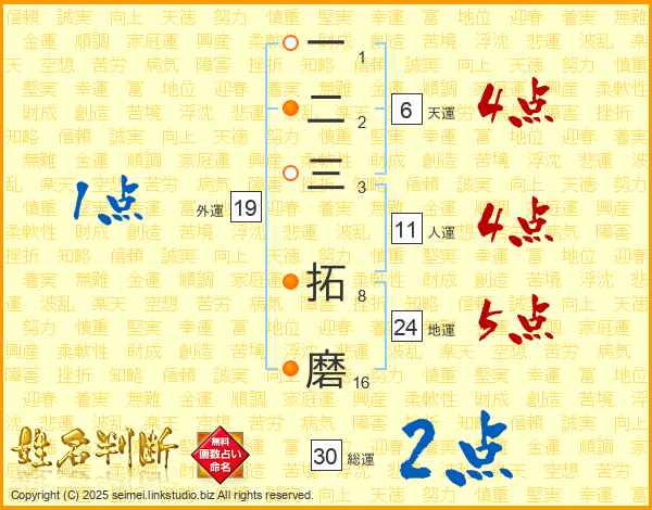 生活面を象徴する運勢です。外部から受ける影響力を表し、結婚運、家庭運や職場、環境への順応性を表します。総運から人運を引いた画数。姓や名が1文字の場合を除く。