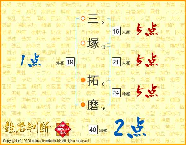 三(3画)塚(13画) 拓(8画)磨(16画)