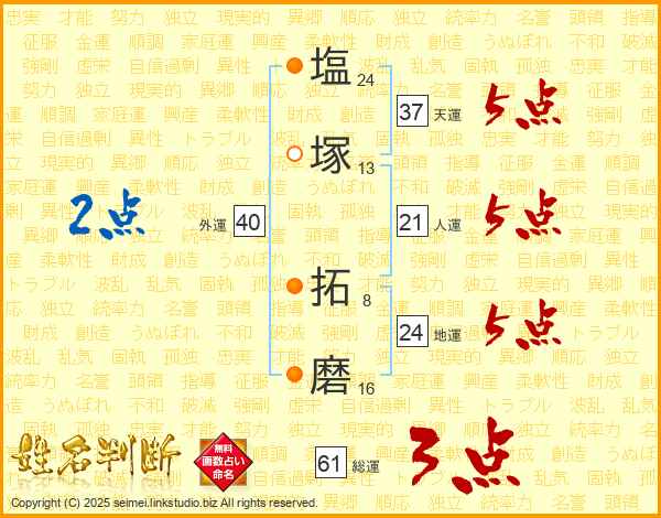 塩(24画)塚(13画) 拓(8画)磨(16画)