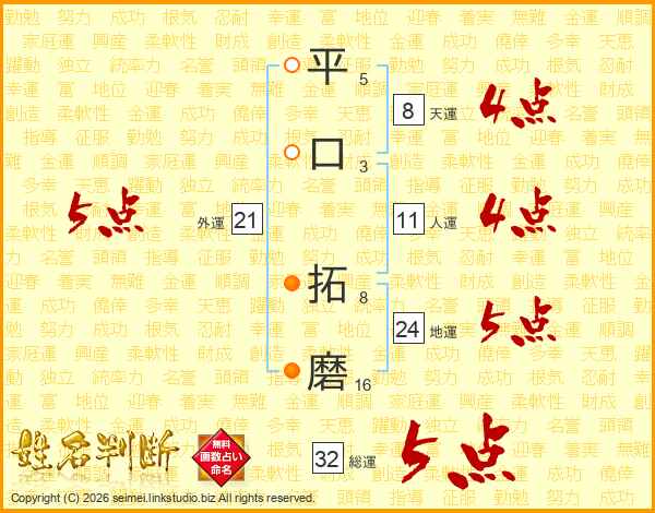 平口拓磨さんの総運は32画の5点!