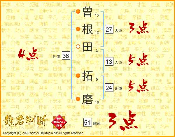 曽(12画)根(10画)田(5画) 拓(8画)磨(16画)