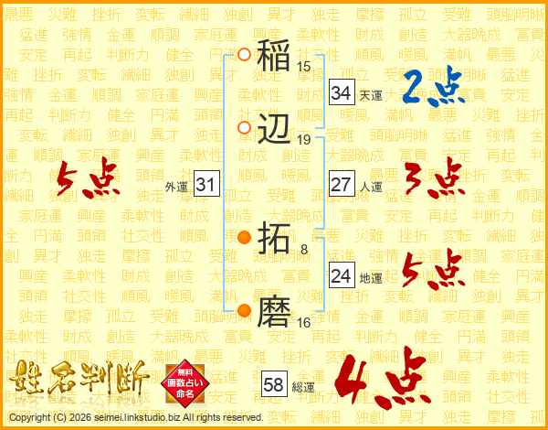 稲辺拓磨さんの総運は58画の4点!