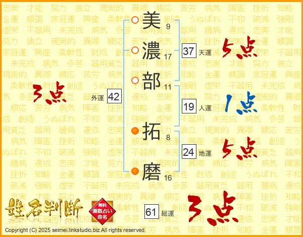 美(9画)濃(17画)部(11画) 拓(8画)磨(16画)