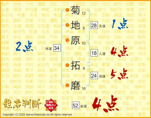 菊(12画)地(6画)原(10画) 拓(8画)磨(16画)