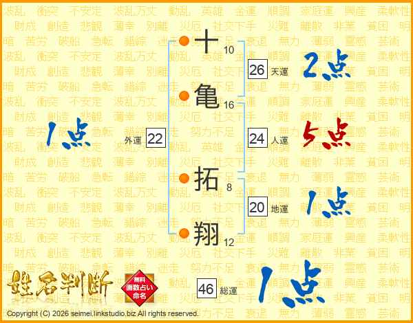十(10画)亀(16画) 拓(8画)翔(12画)