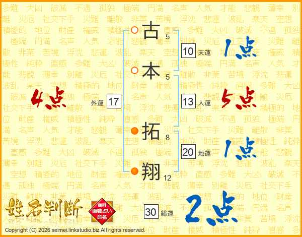 古本拓翔さんの人運は13画の5点!