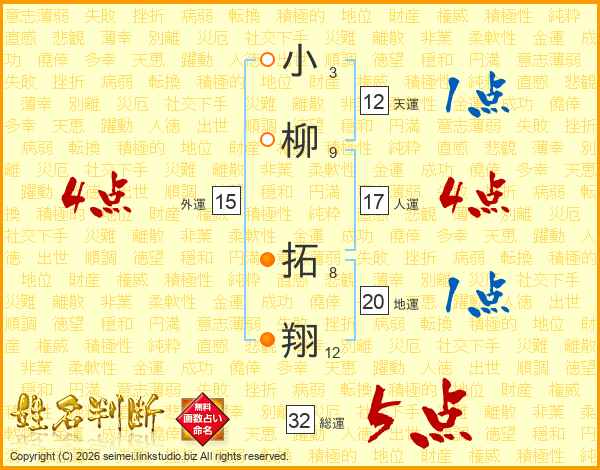 小(3画)柳(9画) 拓(8画)翔(12画)