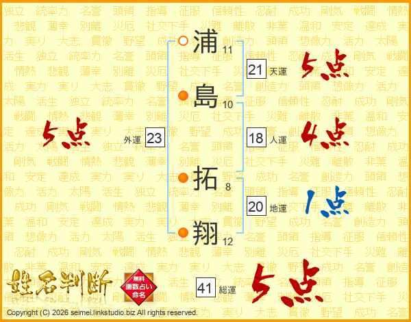 浦島拓翔さんの総運は41画の5点!
