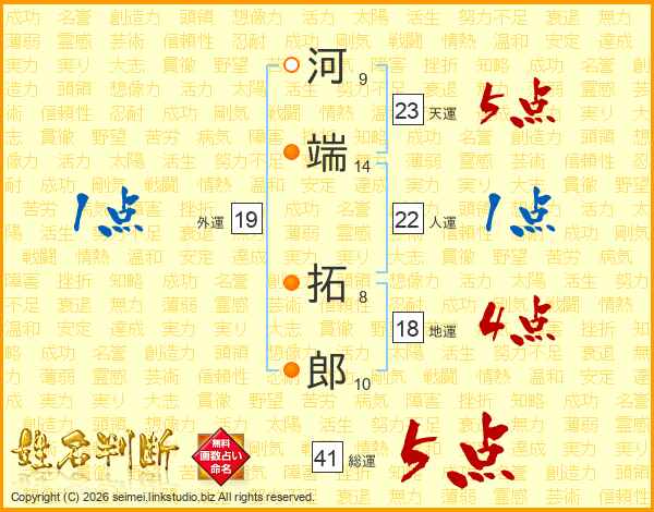 河端拓郎さんの総運は41画の5点!