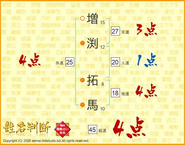 増(15画)渕(12画) 拓(8画)馬(10画)