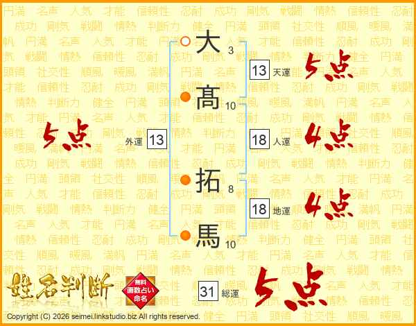 大(3画)髙(10画) 拓(8画)馬(10画)
