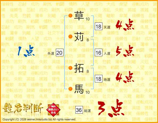 草(10画)苅(8画) 拓(8画)馬(10画)