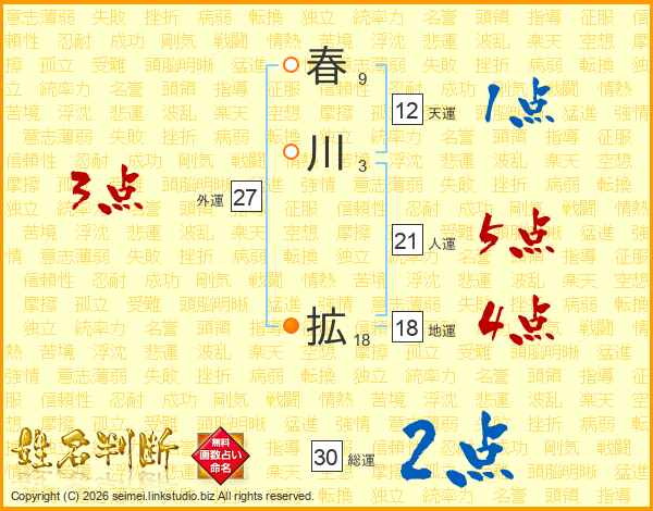 生活面を象徴する運勢です。外部から受ける影響力を表し、結婚運、家庭運や職場、環境への順応性を表します。総運から人運を引いた画数。姓や名が1文字の場合を除く。