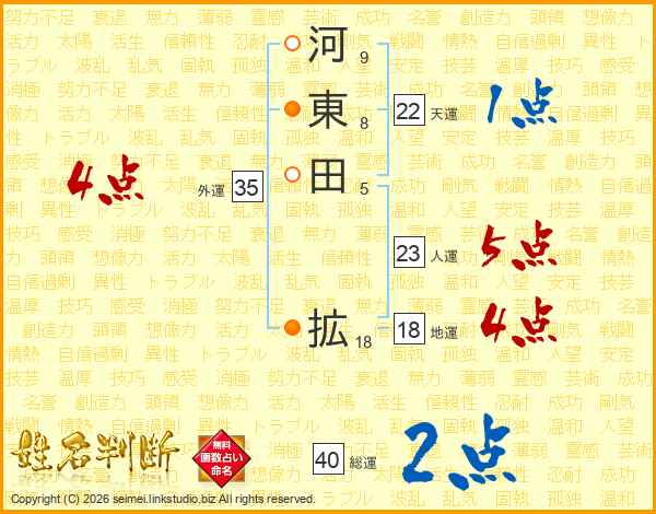 生活面を象徴する運勢です。外部から受ける影響力を表し、結婚運、家庭運や職場、環境への順応性を表します。総運から人運を引いた画数。姓や名が1文字の場合を除く。