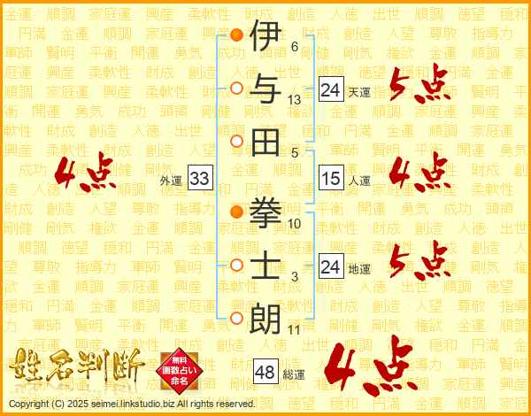 伊(6画)与(13画)田(5画) 拳(10画)士(3画)朗(11画)