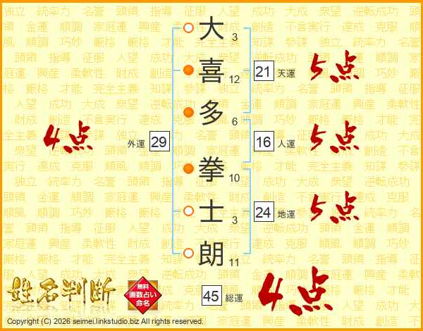 大喜多拳士朗さんの総運は45画の4点!