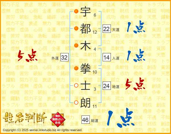 宇(6画)都(12画)木(4画) 拳(10画)士(3画)朗(11画)