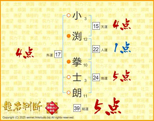 小渕拳士朗さんの総運は39画の5点!