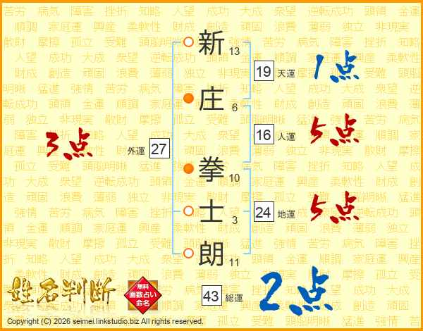 新(13画)庄(6画) 拳(10画)士(3画)朗(11画)