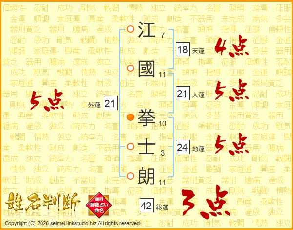 江(7画)國(11画) 拳(10画)士(3画)朗(11画)