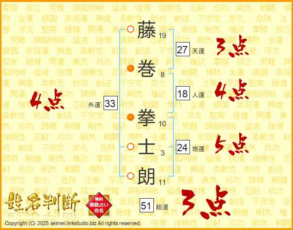 藤(19画)巻(8画) 拳(10画)士(3画)朗(11画)