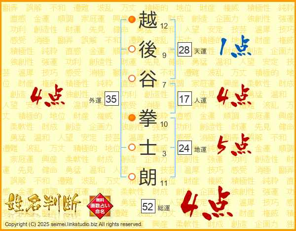 越(12画)後(9画)谷(7画) 拳(10画)士(3画)朗(11画)
