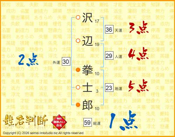 沢(17画)辺(19画) 拳(10画)士(3画)郎(10画)