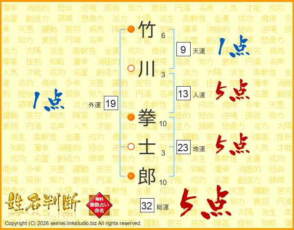 竹川拳士郎さんの総運は32画の5点!