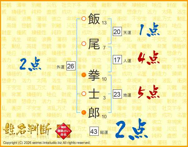 飯(13画)尾(7画) 拳(10画)士(3画)郎(10画)