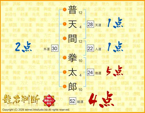普(12画)天(4画)間(12画) 拳(10画)太(4画)郎(10画)
