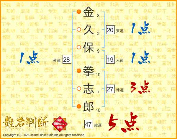 金(8画)久(3画)保(9画) 拳(10画)志(7画)郎(10画)