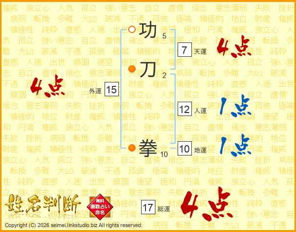 生活面を象徴する運勢です。外部から受ける影響力を表し、結婚運、家庭運や職場、環境への順応性を表します。総運から人運を引いた画数。姓や名が1文字の場合を除く。
