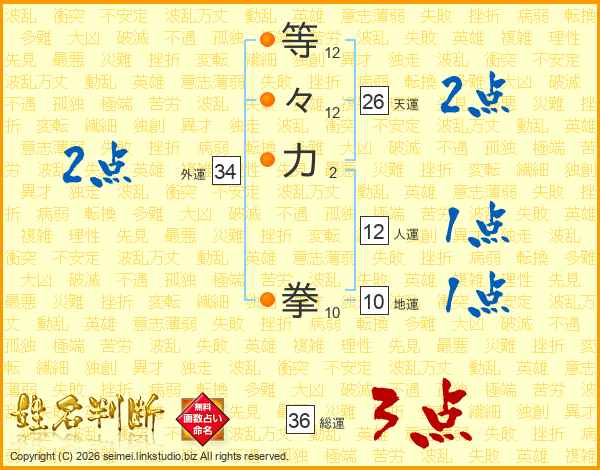 生活面を象徴する運勢です。外部から受ける影響力を表し、結婚運、家庭運や職場、環境への順応性を表します。総運から人運を引いた画数。姓や名が1文字の場合を除く。