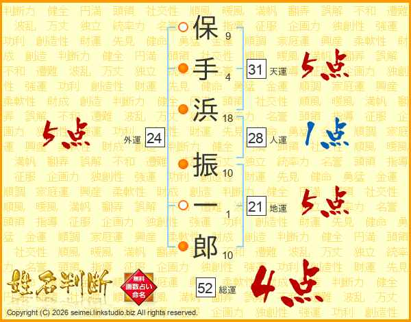 保(9画)手(4画)浜(18画) 振(10画)一(1画)郎(10画)