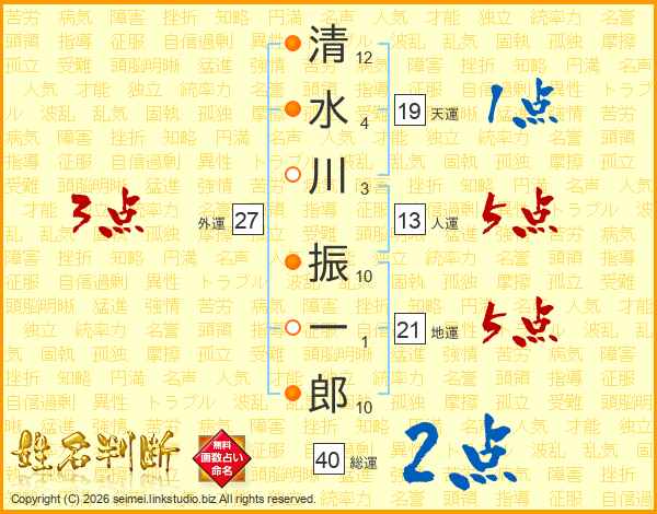 清(12画)水(4画)川(3画) 振(10画)一(1画)郎(10画)
