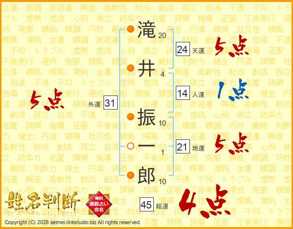 滝井振一郎さんの総運は45画の4点!