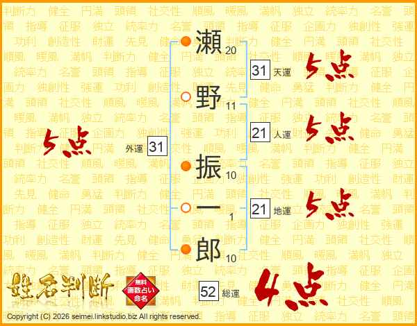 瀬(20画)野(11画) 振(10画)一(1画)郎(10画)