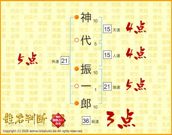 神(10画)代(5画) 振(10画)一(1画)郎(10画)