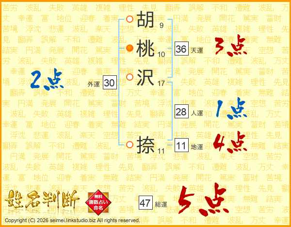 あなたの人生を表す1番重要な運勢です。生涯を通じて影響する総合運となり、主に50歳以降の晩年期に影響を及ぼします。苗字と名前の合計画数。