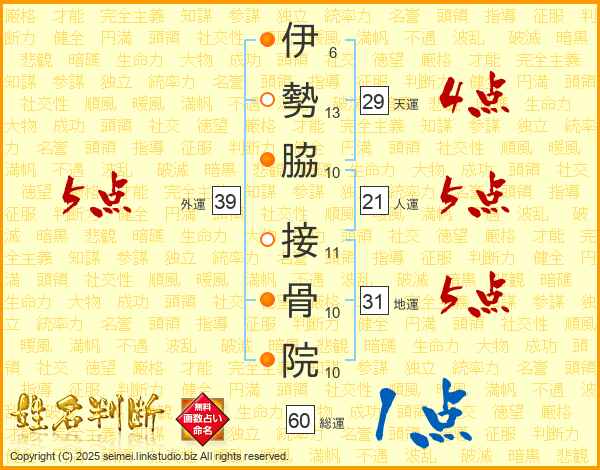 伊(6画)勢(13画)脇(10画) 接(11画)骨(10画)院(10画)